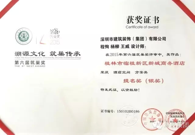 中国品牌网讯:近日,由中国建筑装饰协会主办的中国国际空间环境艺术设计大赛(筑巢奖)奖项揭晓,深装集团设计研究院参评的桂林市临桂新区新城商务酒店设计获2015第六届中国国际空间环境艺术设计大赛···